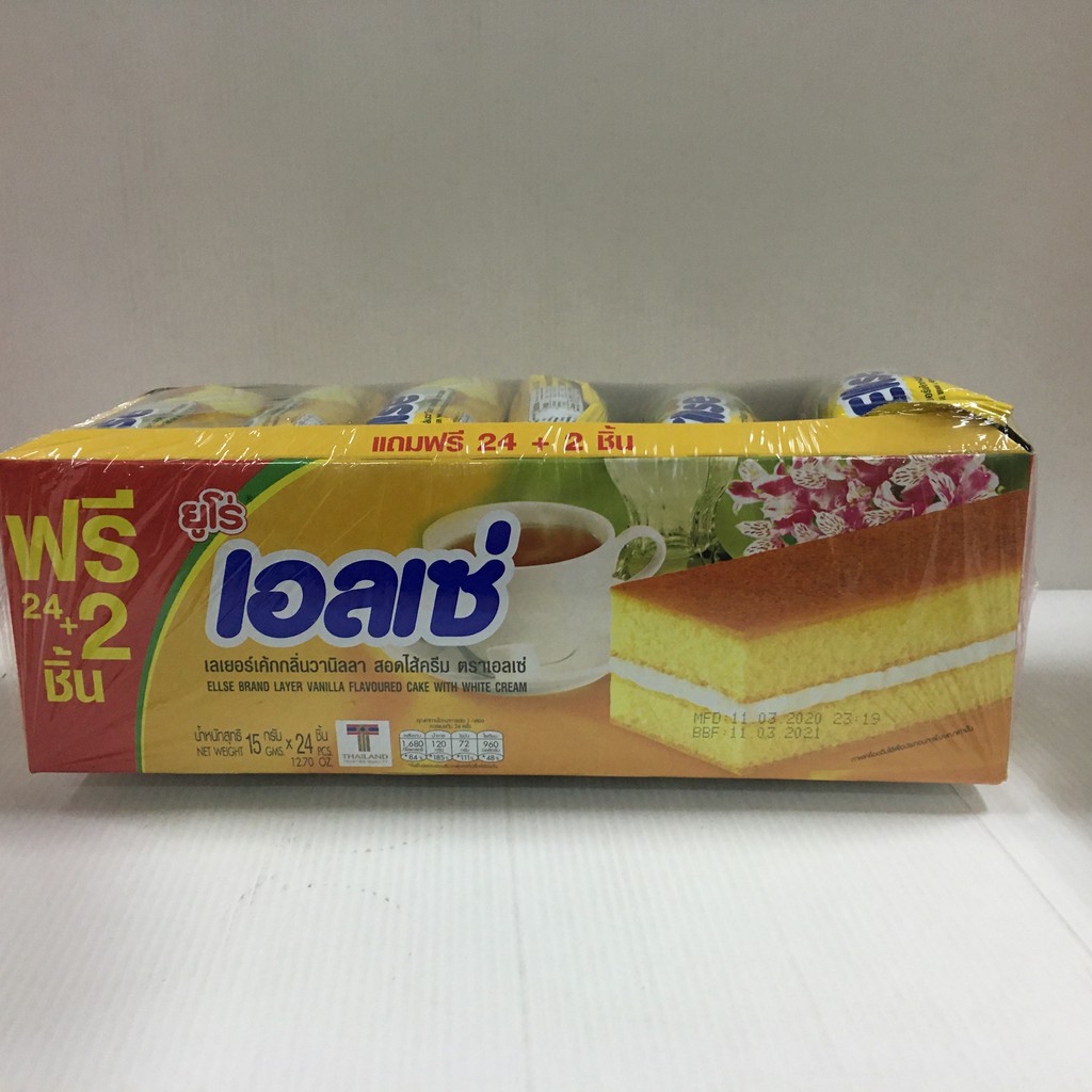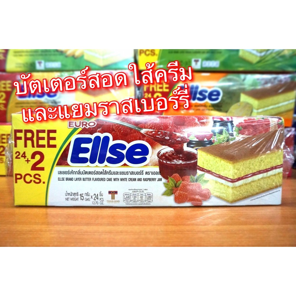 ยูโร่ เอลเซ่ เลเยอร์เค้กกลิ่นวานิลลา สอดไส้ครีม euro ellse layer vanilla flavoured cake with white cream. เอลเซ่เลเยอร์รสสตอเบอรี่ 360 g (24st) ellse brand layer strawberry flavoured cake with white cream 360 g (24st) quantity. เลเยอร์เค้ก สอดไส้ครีม ตราเอลเซ่ มีทั้งหมด 7 รสชาติ ดังนี้ มะพร้าว,วานิลา,ช็อกโกแลต,กล้วยหอม,ใบเตย,สตรอ. เอลเซ่ เลเยอร์เค้กกลิ่นวานิลลา สอดไส้ครีม 24กรัม x 6 ชิ้น. ยูโร่ เอลเซ่ เลเยอร์เค้กหลากรสชาติ 15 กรัม x 24 ชิ้น